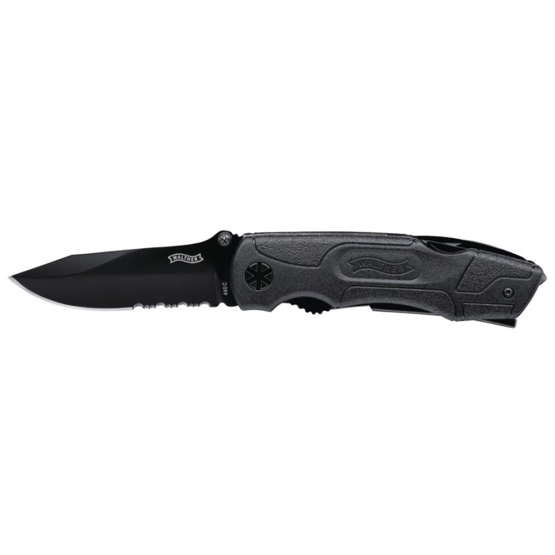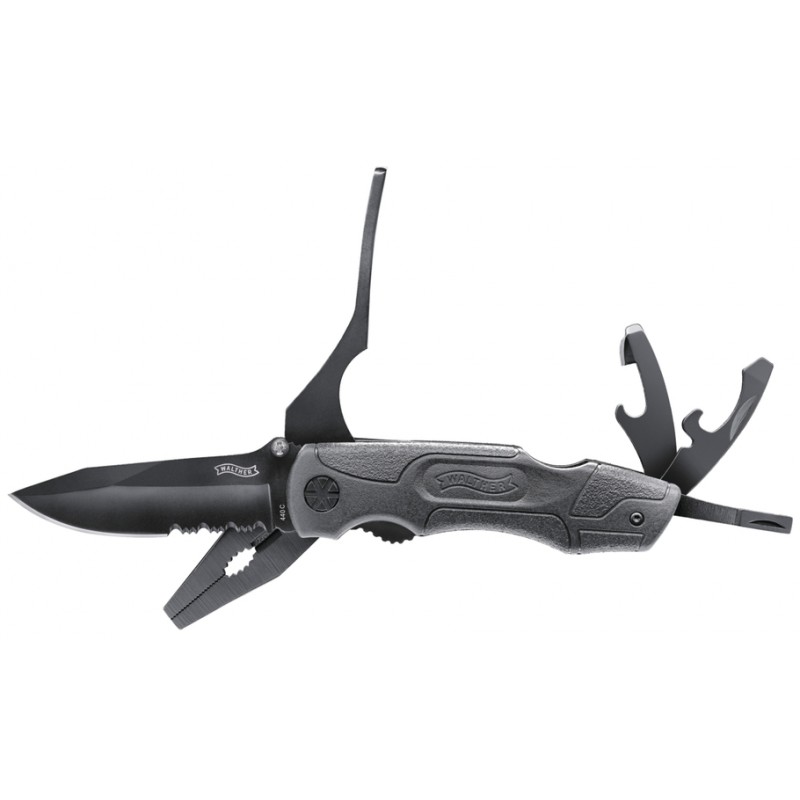 Grâce à ses outils polyvalents, qui comprennent une pince, un brise-verre, un ouvre-bouteille, un décapsuleur, un tournevis et un porte-embout, il est l'un des couteaux Walther les plus vendus.