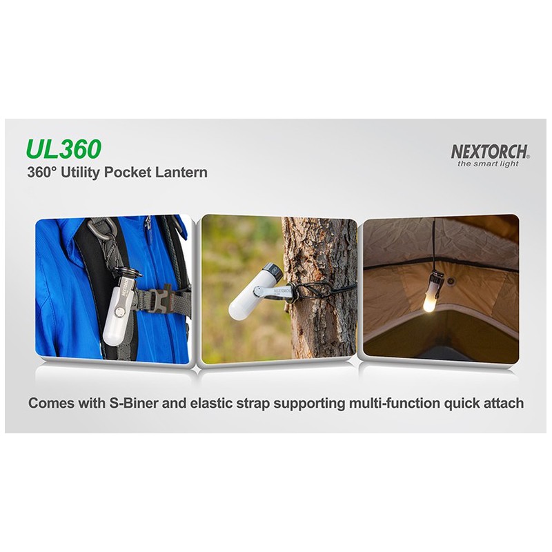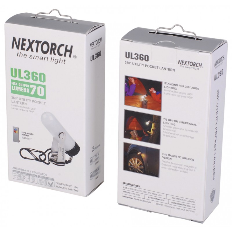 Type: LANTERNE - Marque: NEXTORCH - Modèle: UL360 - Coloris: BLANC - Intensité (Lum): 70 LM - Portée (m): 5 m - Autonomie: 3h15 - Ø Corps (mm): 34 mm - Longueur (mm): 78 mm - Alimentation: LR06 - Nbre de piles: X1 - Poids (g): 63 g